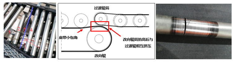 底带摩擦驱动模式中,常见的导致辊筒损坏的因素出现在靠边式校准机当中。由于底部驱动皮带的改向辊比较粗壮,且往往位于过渡辊正下方,稍有不慎便会对上方辊筒产生挤压。实际案例中甚至有无动力辊筒整根被顶起,高于相邻辊筒辊面的情况。